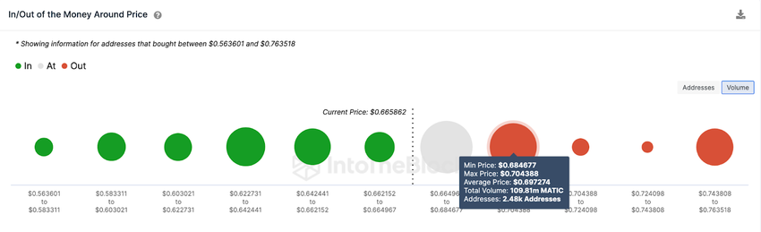 According to IntoTheBlock’s Global In/Out of The Money Around Price (GIOM) data, 2,480 investors that bought 109.81 million MATIC at the average price of $0.70 could trigger a pullback.