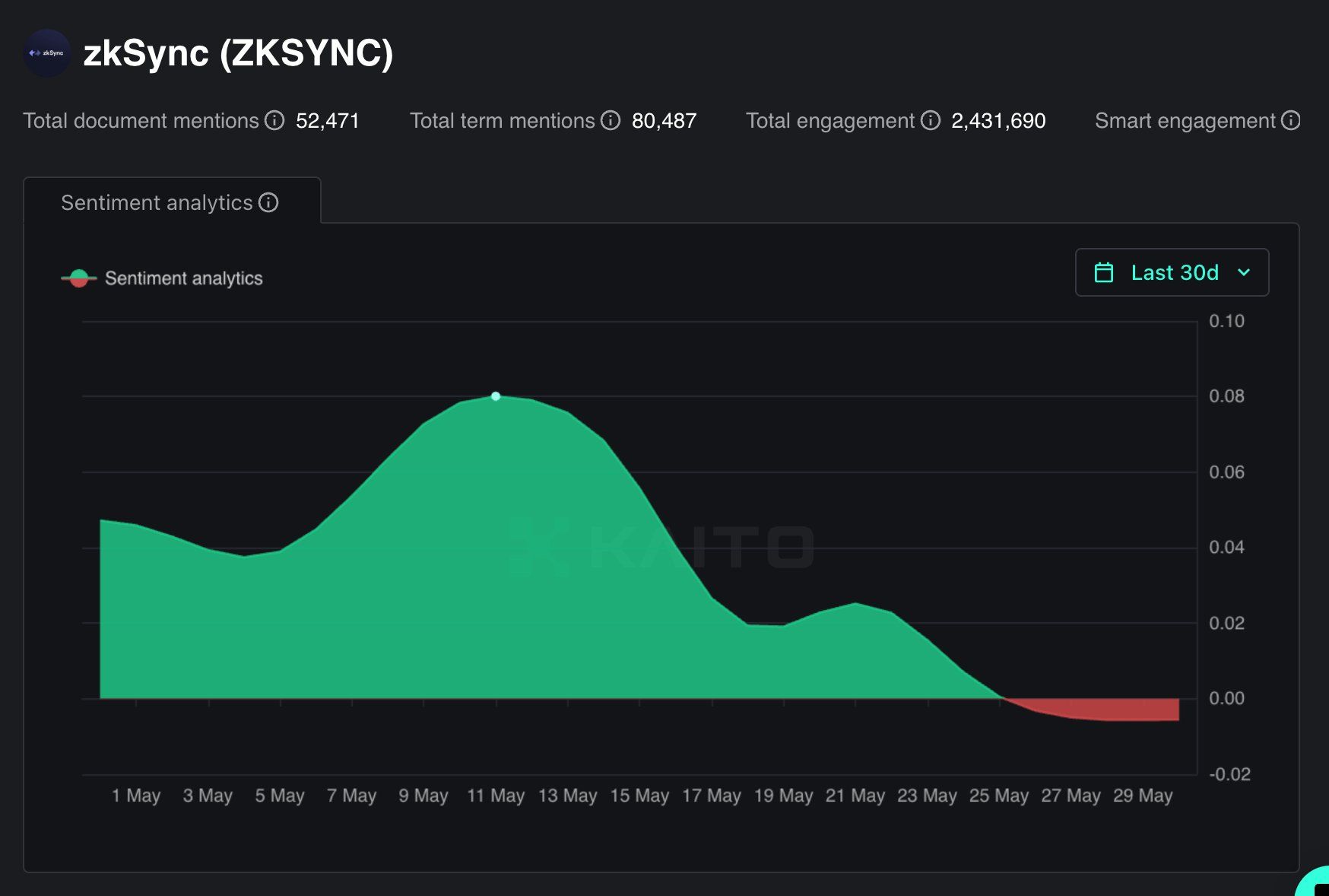 The disagreement over Matter Labs’ trademark applications resonated deeply within the broader crypto community. Data from the Web3 information platform Kaito showed a significant dip in the sentiment analytics score for zkSync, reflecting the community’s negative response in the last few days of May.