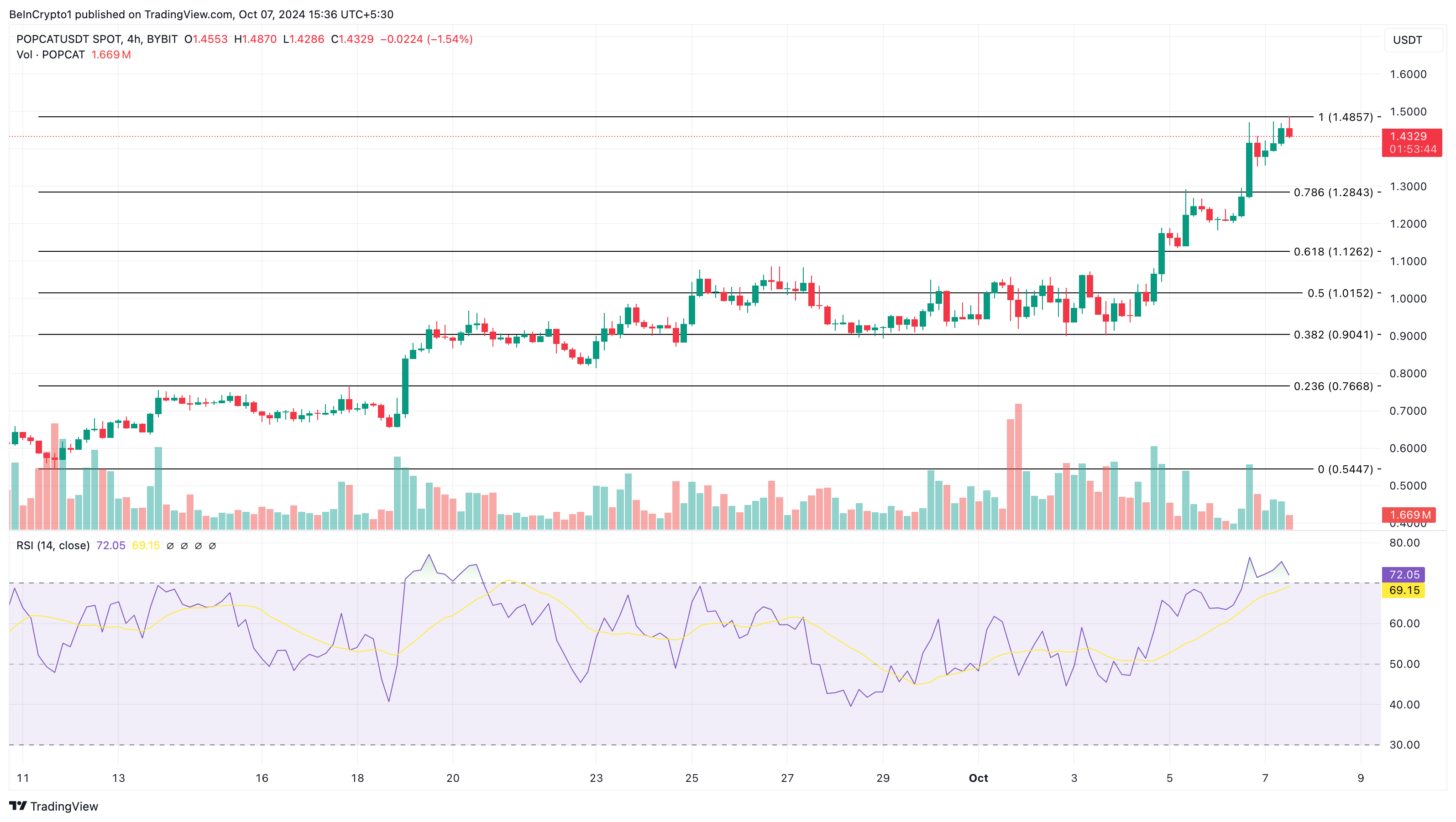 On Saturday, October 5, BeInCrypto reported that POPCAT hit a new all-time high of $1.29. Today, the price has surpassed that, reaching $1.43. This increase signals strong investor interest in the meme coin.