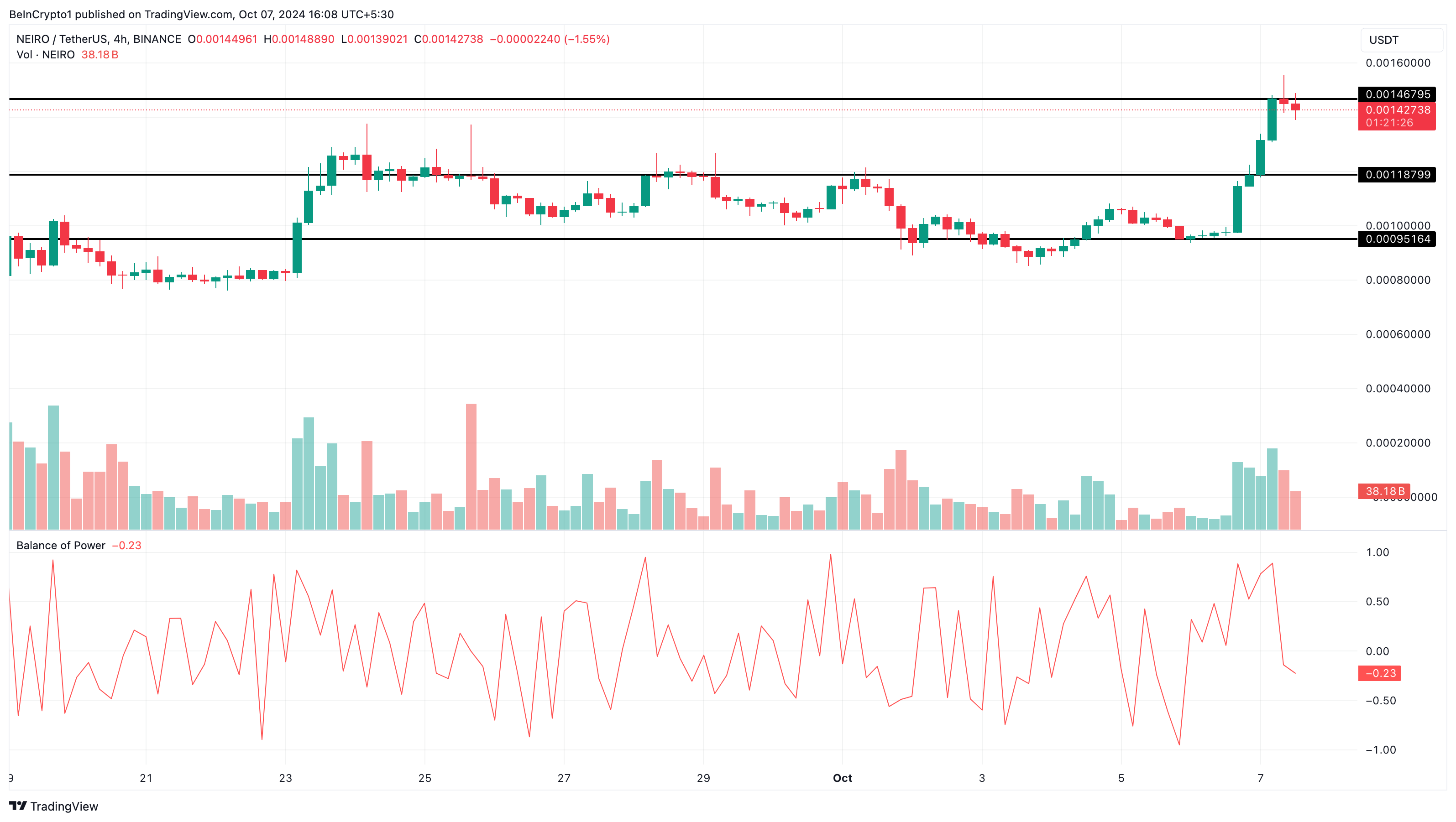 Should this continue, NEIRO’s price might soon decline to $0.0012. However, if bulls reclaim dominance, the current price trend might turn around, and the meme coin’s value could jump past $0.0016.