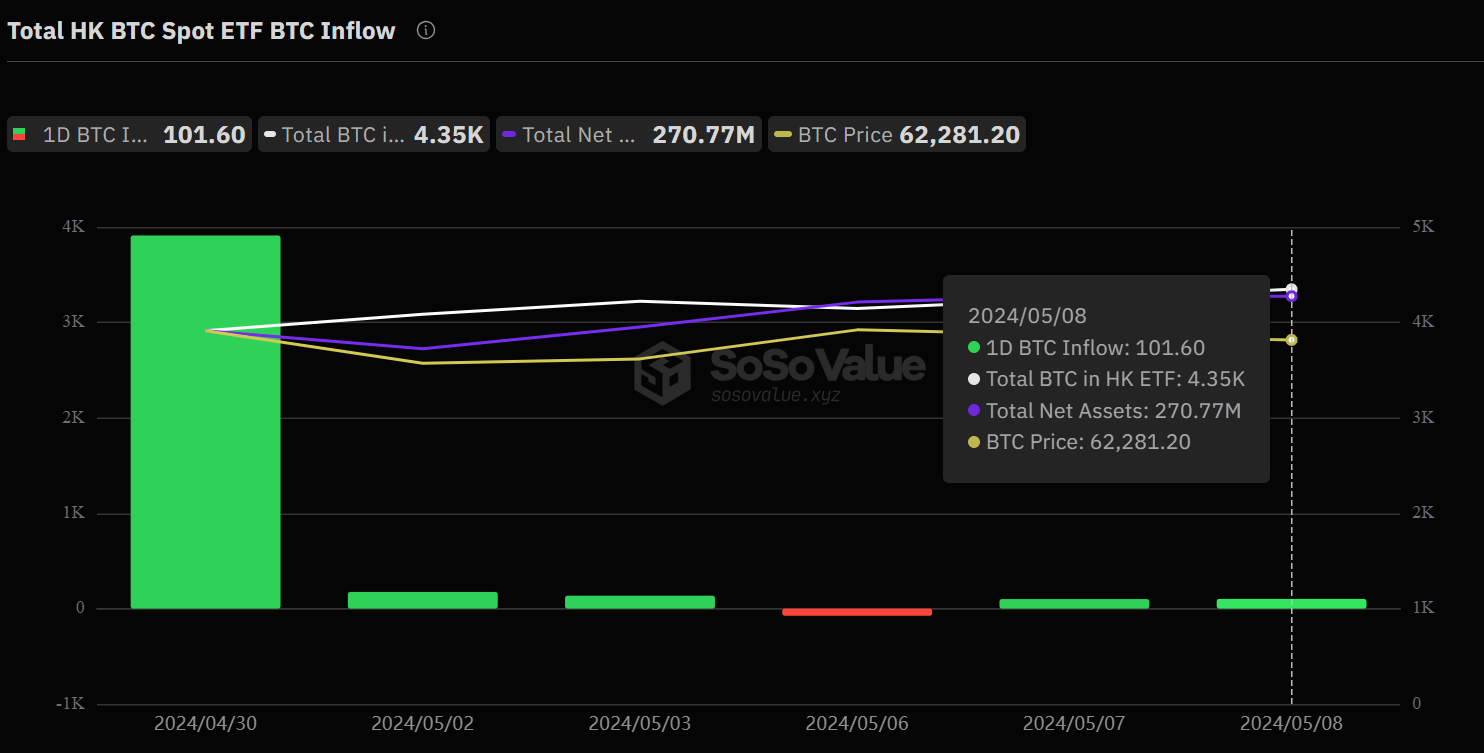 According to SoSo Value data, Hong Kong spot Bitcoin ETFs recorded an inflow of 101.6 BTC (approximately $6.32 million) on May 8. On the same day, spot Ethereum ETFs in Hong Kong saw an outflow of 644.78 ETH (roughly $1.91 million).