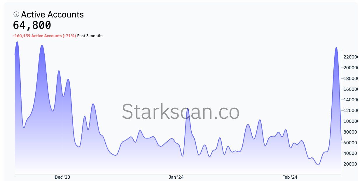 “Starknet became the ghost chain again. Active accounts peaked at 226,000 yesterday, and now it’s back to 64,000. I doubt about the user retention on this chain,” on-chain analyst Hitesh Malviya wrote.