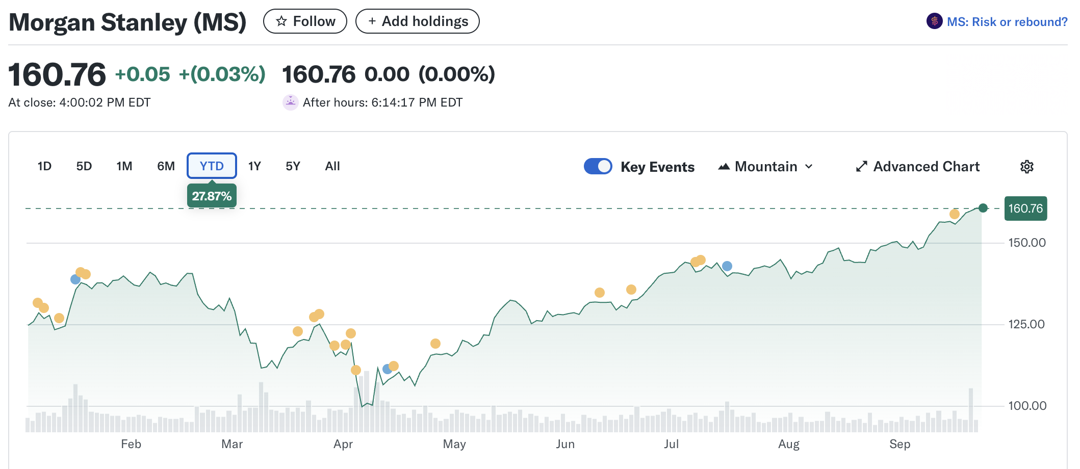 On the day, Morgan Stanley shares rose as much as 1.93% to $163.8 in early trading before retreating to their opening level, ultimately closing the session unchanged. Year-to-date, the stock has gained 27.8%, reflecting strong investor confidence.