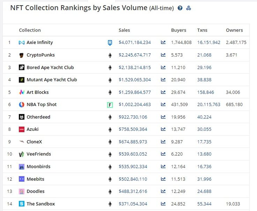 MAYC still trails its sister projects Bored Ape Yacht Club (BAYC), CryptoPunks, and Axie Infinity on the all-time sales volume rankings.Â