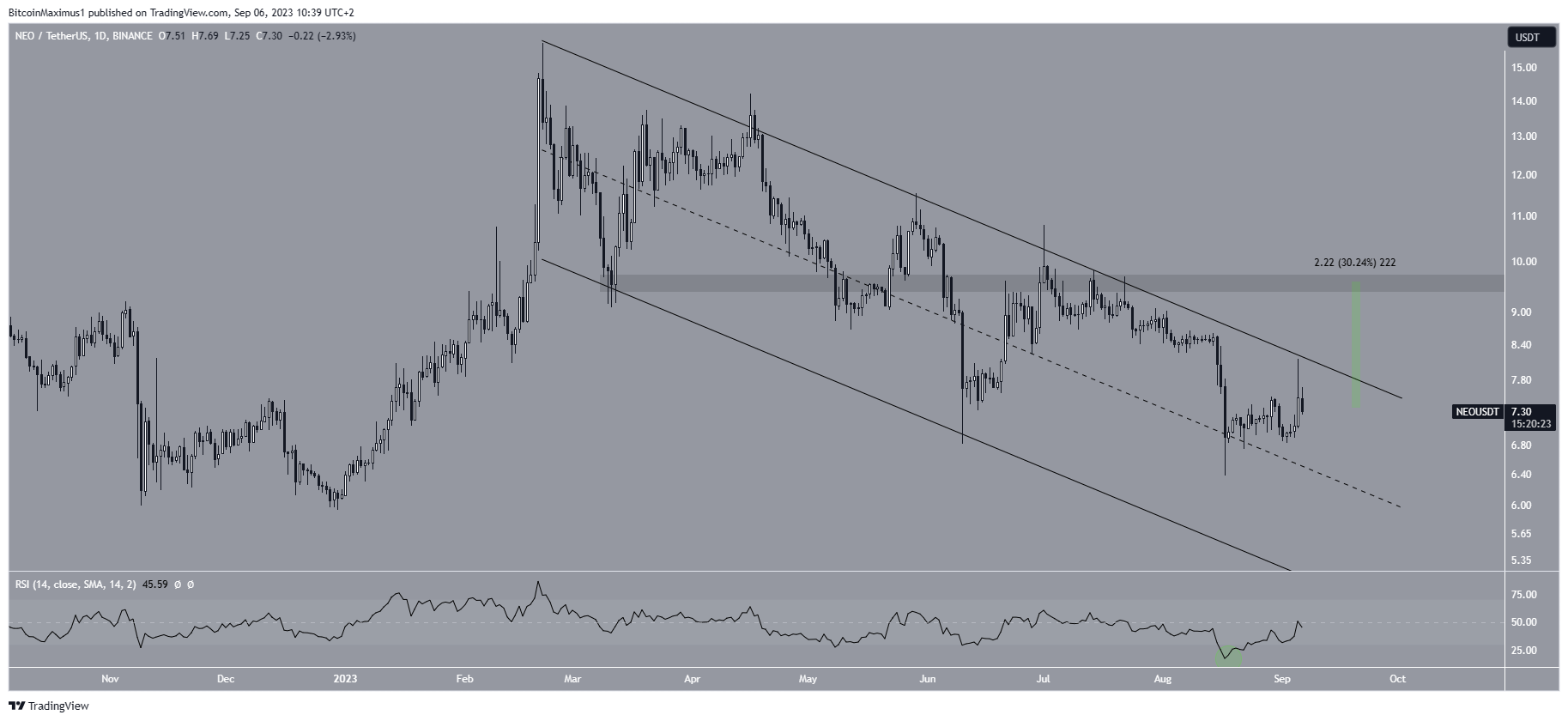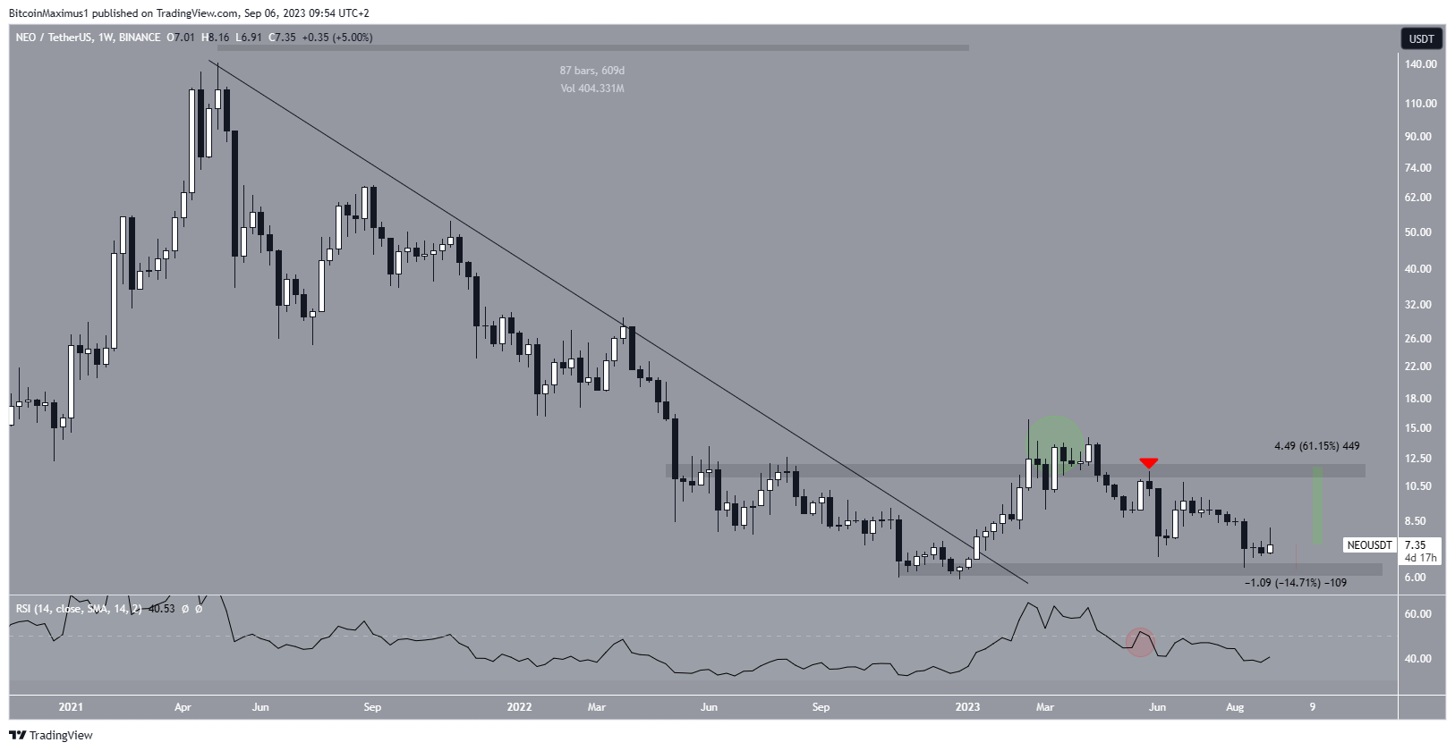 However, the alleged breakout (green circle) was only a deviation. Shortly afterward, NEO fell below the horizontal area, validating it as resistance (red icon). This led to a low of $6.38 in August.