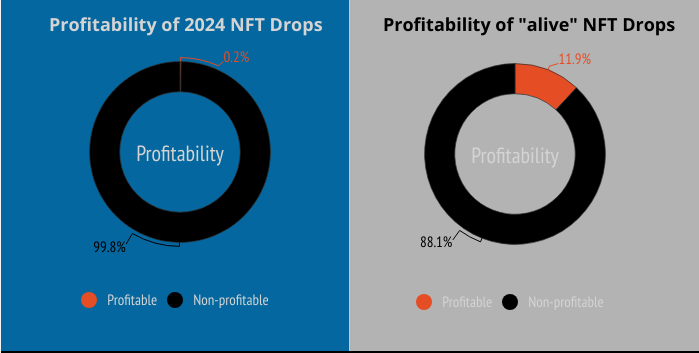 Further, only 0.2% of 2024 NFT drops have profited their investors. Even among “alive” NFTs that still see some trading activity, just 11.9% have been profitable. This reflects the challenges creators face in delivering investment returns in the current climate.