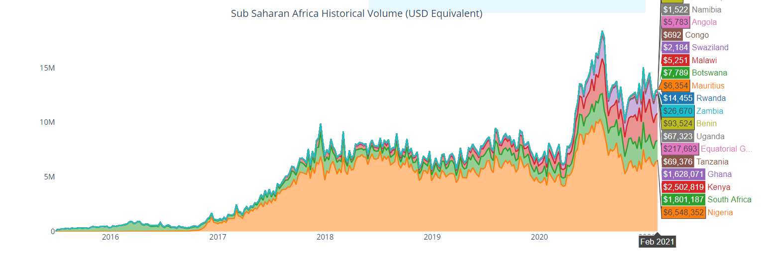 The country is the biggest market for digital currency in Africa. Data from Useful Tulip reveals that it has the highest traded volume in Africa, followed by Kenya and South Africa. Trading volumes in these countries sit at about $6.5 million, $2.5 million, and $1.8 million, respectively.