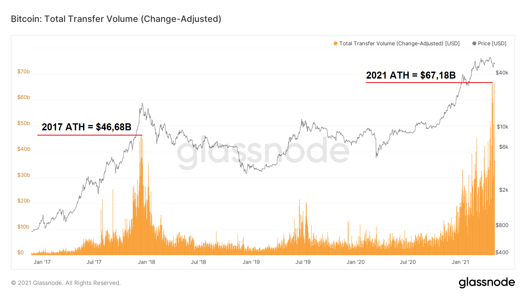 This corresponds to the indicator of total transfer volume, which hit the new ATH at the level of $67.18 billion of daily volume. The previous all-time high from 2017 was $46.68 billion at the height of the bull run. As of today, it is an increase of over 40%.