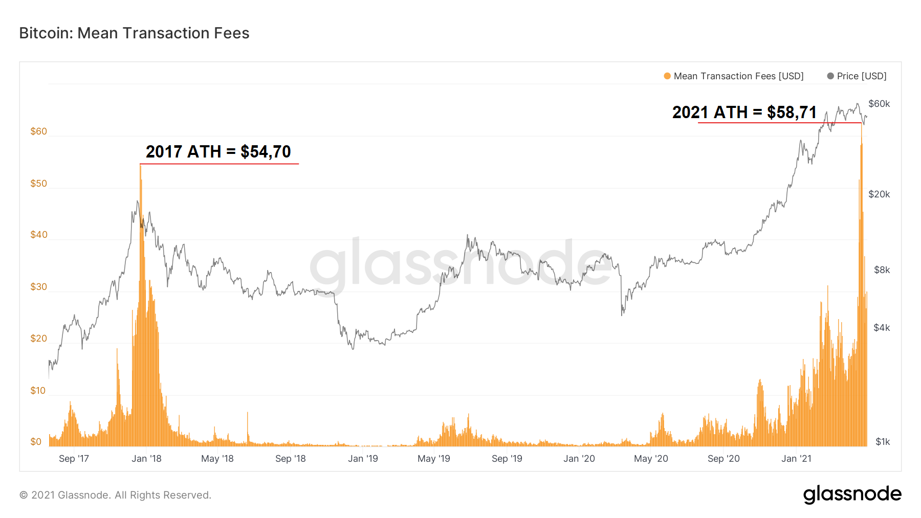 SponsoredThe gigantic spike in Bitcoin network activity led to an increase in the average transaction fee to $58.71 on April 22, which is the new ATH. It is worth adding that the highest average fees in the previous cycle were $54.70.
