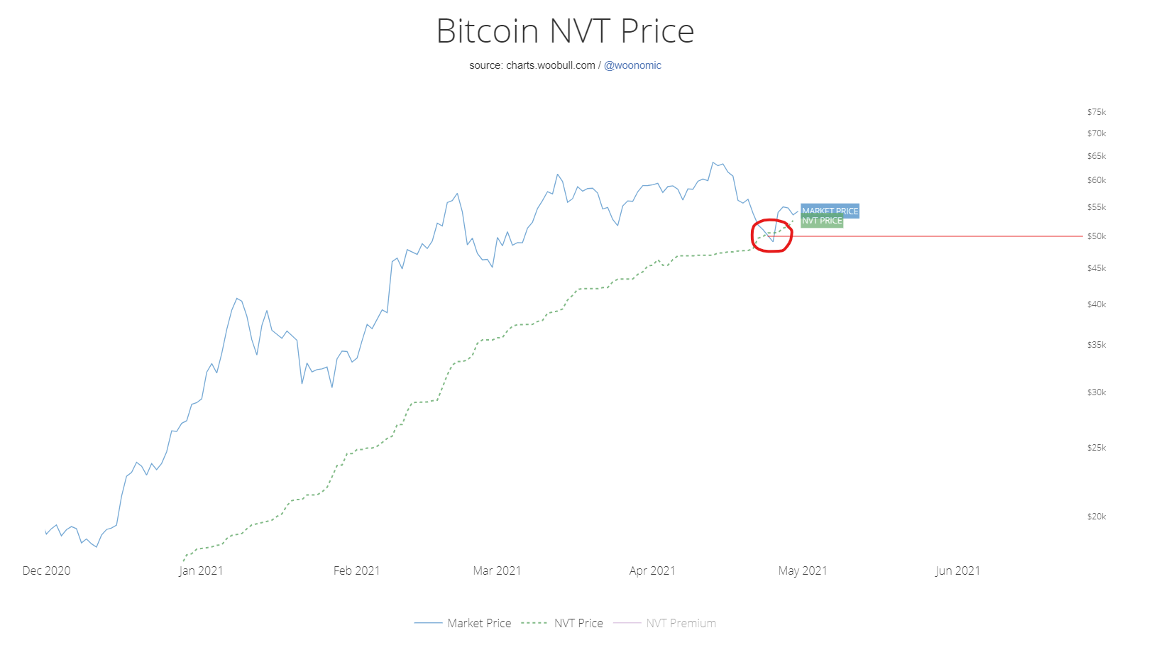 In the short term chart, we can see that the first intersection within this bull market was on April 24 in the $50,000 area. The bounce pushed the price above the NVR lince again. If the BTC price continues to consolidate, it cannot be ruled out that the curves will cross several times before their next divergence.