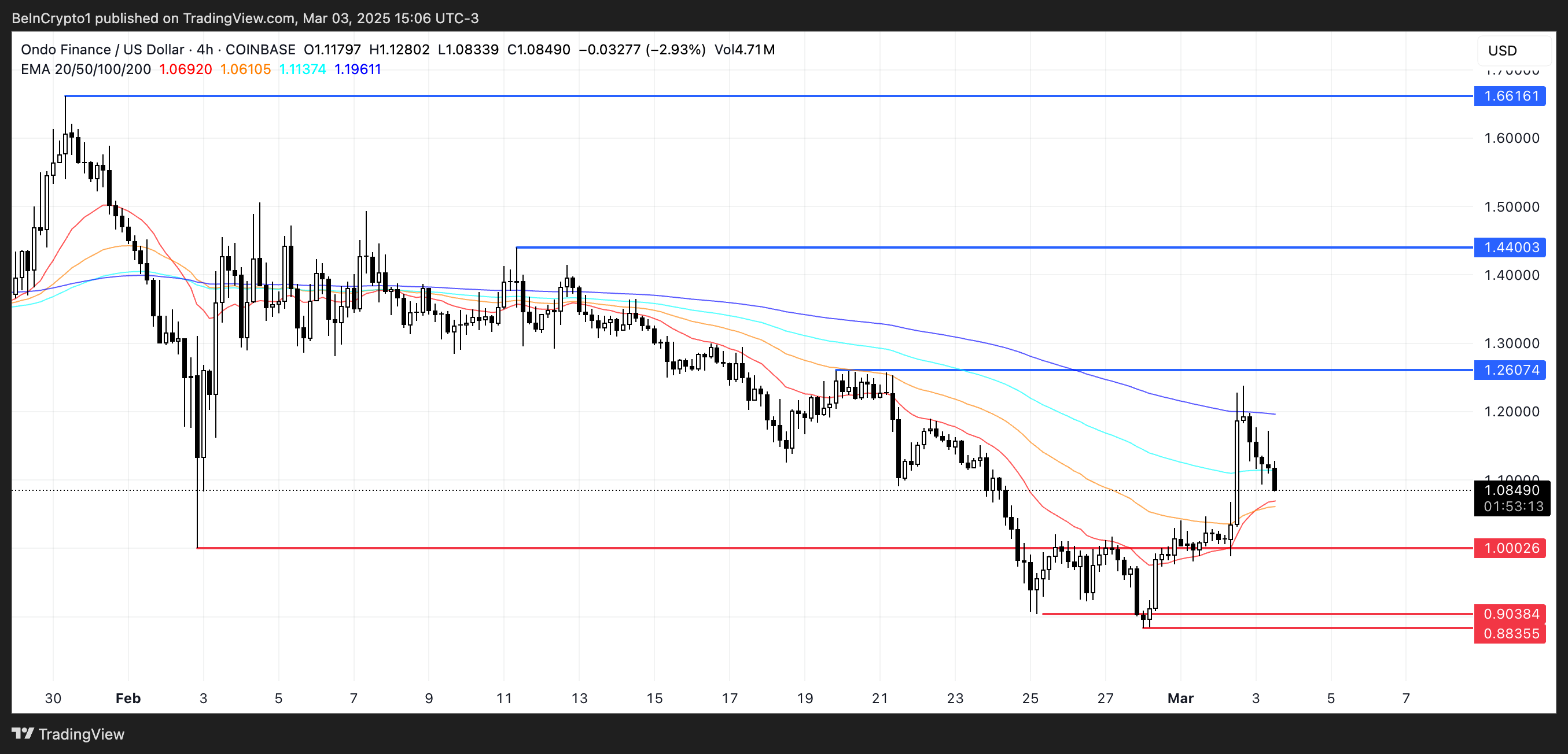 In that scenario, it could break through resistance at $1.26 and $1.44, with a strong rally potentially sending it toward $1.66.