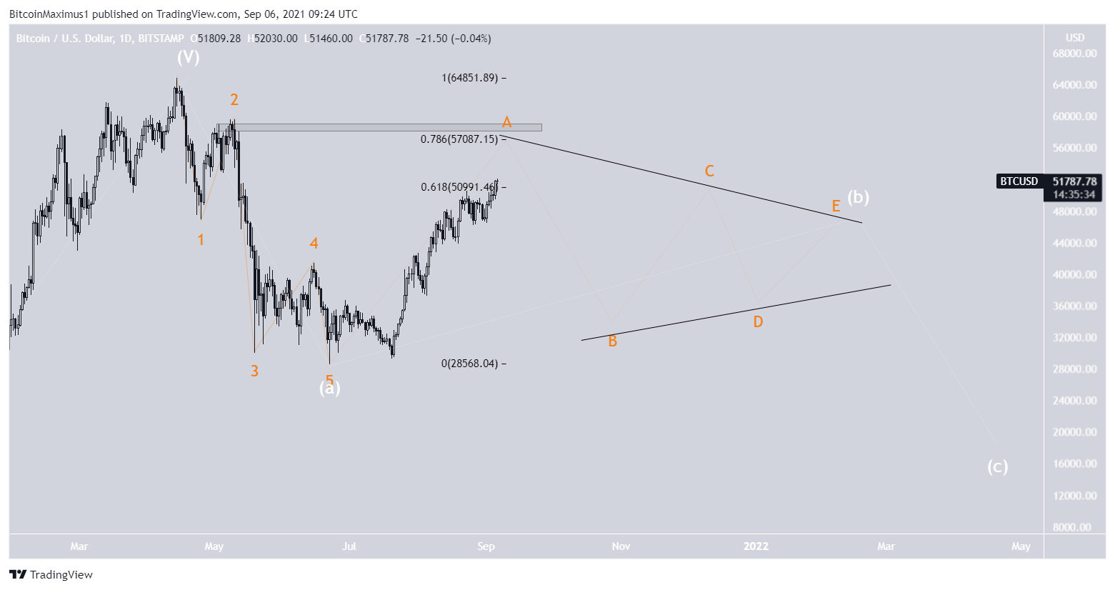The corrective count suggests that BTC is still in a B corrective wave (white). The sub-wave count is shown in orange.