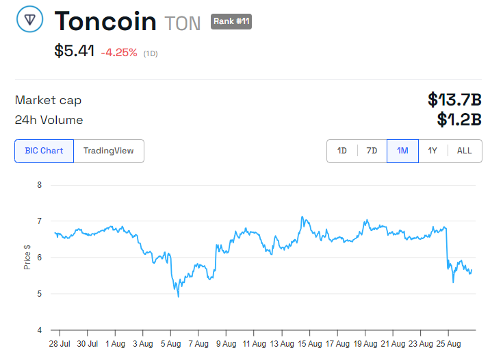 BeInCrypto data shows that Toncoin (TON) is down nearly 5%, currently trading at $5.41. Since news of Pavel Durov’s arrest surfaced, TON has dropped by 20%.