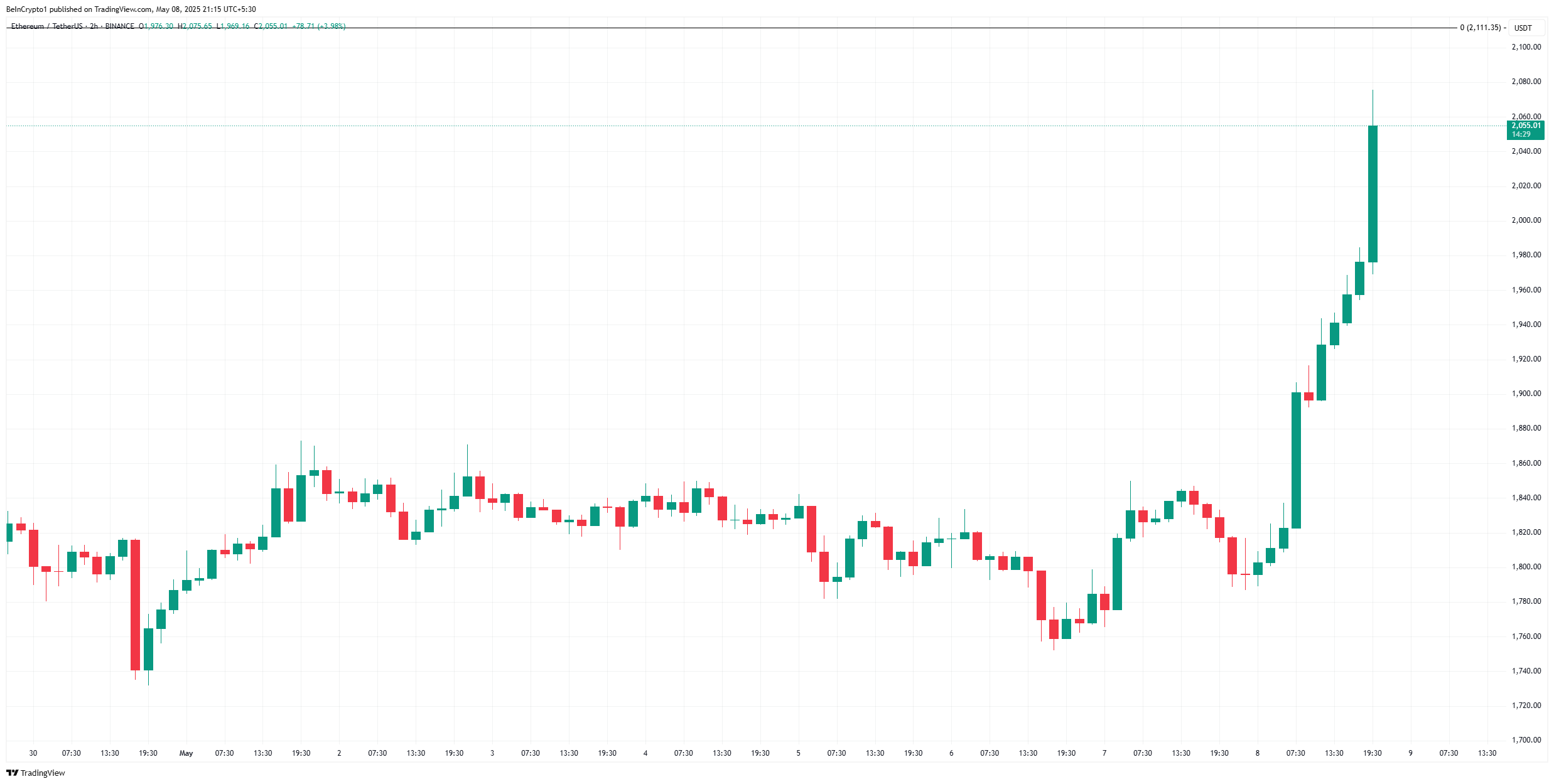 On the daily chart, ETH trades above the horizontal channel, which kept its price within a range between April 23 and May 7. The altcoin faced resistance at $1,872 during that period and found support at $1,744.
