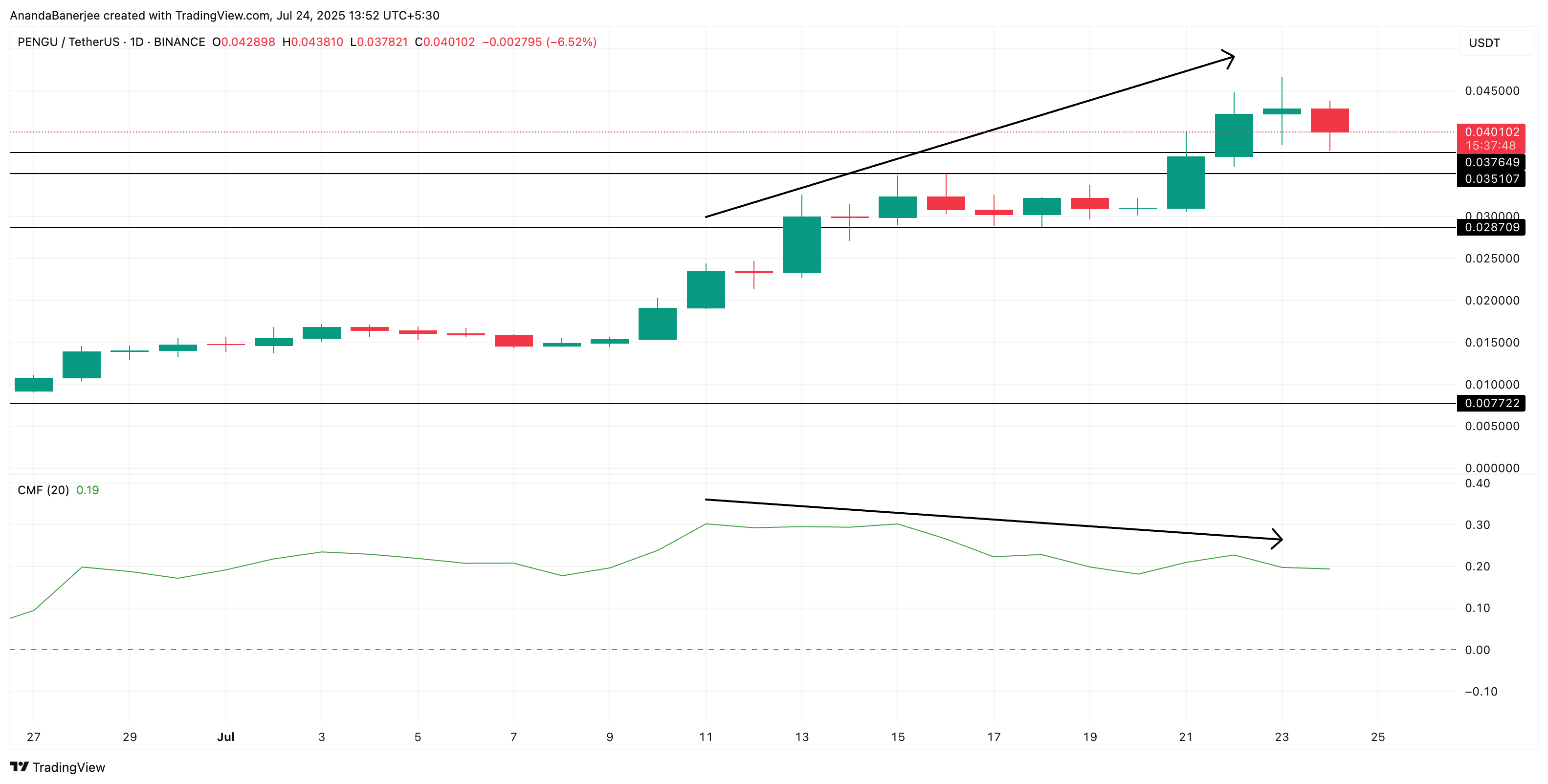 Technically, the PENGU price is holding right above a key support at $0.037, which aligns with the 0.0.236 level of the Fibonacci retracement indicator. It is drawn from the $0.0077 low to its all-time high of $0.46. The $0.037 level has seen bounces before, but if it fails, the next solid support lies near $0.031 — the 0.382 Fib level.