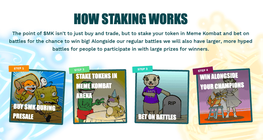 Operating as a tokenized gaming platform, Meme Kombat lets players wager on meme battles by using MK tokens.