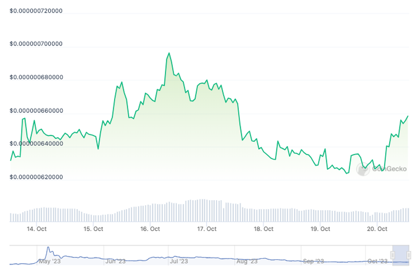PEPE’s price is up almost 6% since yesterday, with the token now trading around the $0.000000656 level.