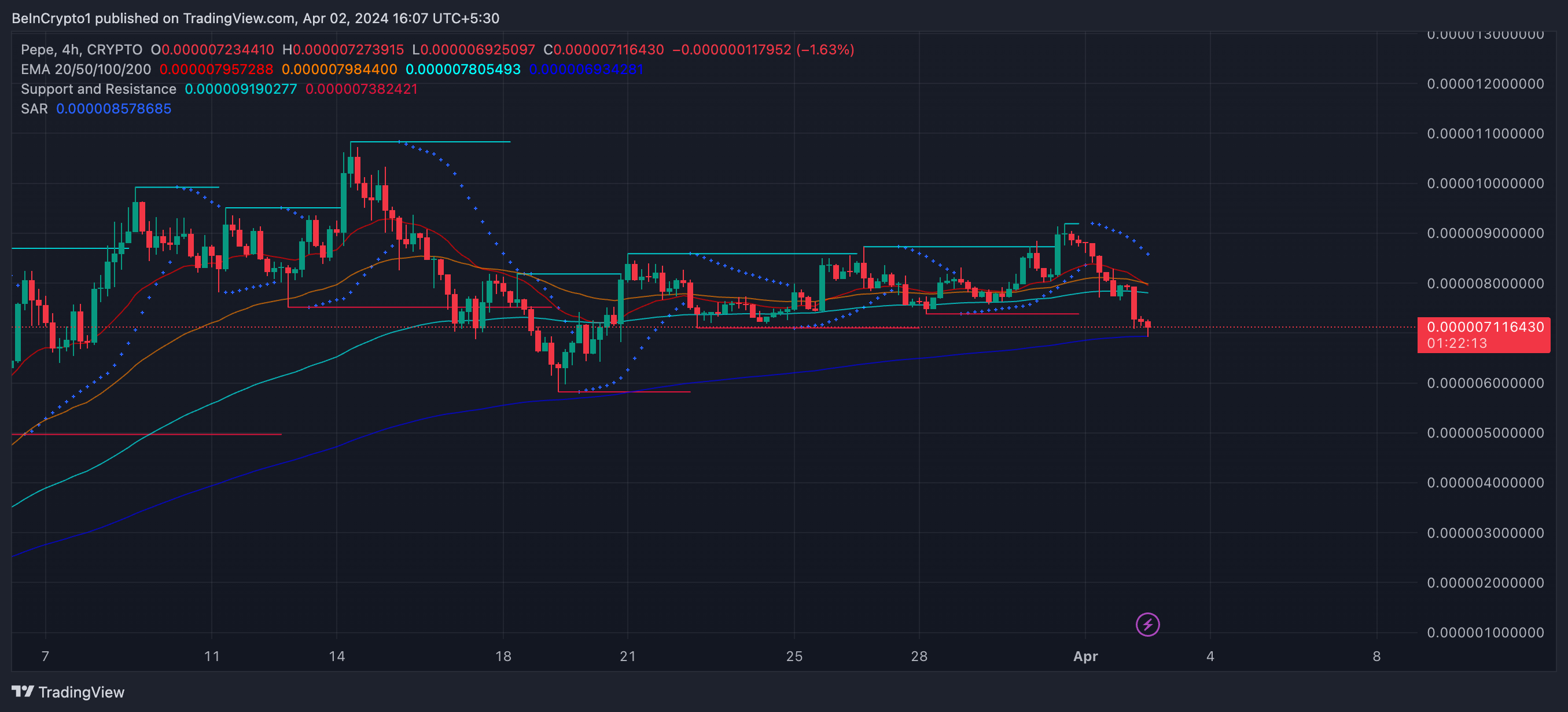 On April 1, the PEPE’s SAR indicator transitioned from bullish to bearish, a shift that has already led to a decline in its price from $0.0000091 to $0.0000070, marking a decrease of approximately 23.08%. The SAR (Stop and Reverse) metric is a pivotal tool for identifying potential market reversals by placing dots either above or below the price line.