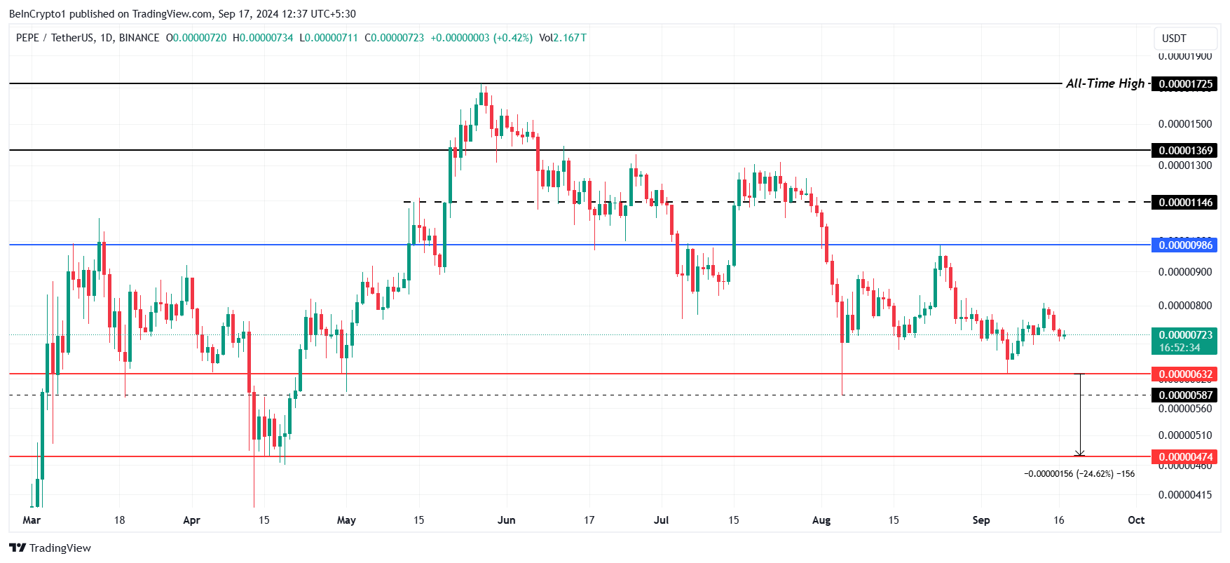 Since the start of August, PEPE’s price has been rangebound between $0.00000986 and $0.00000632. The $0.00000632 level has been tested multiple times as a support, preventing any long-term drawdowns below it. This support has been crucial in keeping PEPE from further declines.