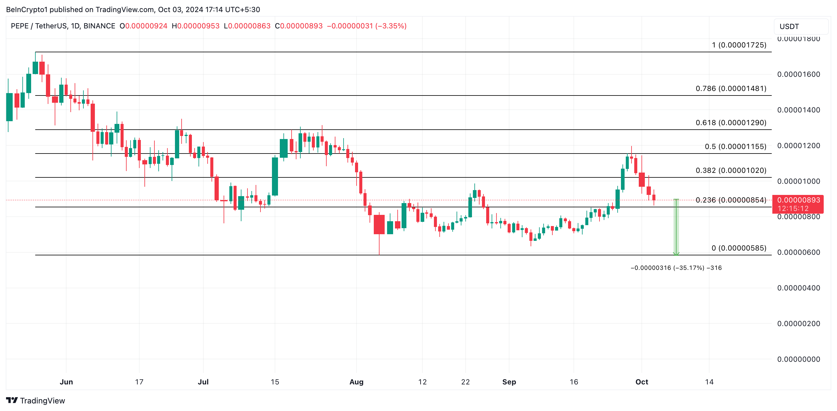 If PEPE’s selling pressure intensifies, the coin could continue its decline. According to its Fibonacci Retracement readings, PEPE may fall an additional 35%, reaching $0.0000058 — a level last seen on August 5.