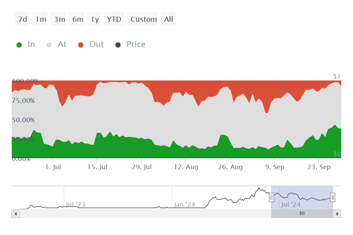 PEPE’s Market Value to Realized Value (MVRV) Ratio at 33% currently sits in the danger zone. The area between 13% and 47% typically signals a heightened risk of corrections. This is because, at these levels, a large number of investors are in profit, which could lead to widespread selling. When profits become abundant, investors often move to lock in gains, putting downward pressure on the price.