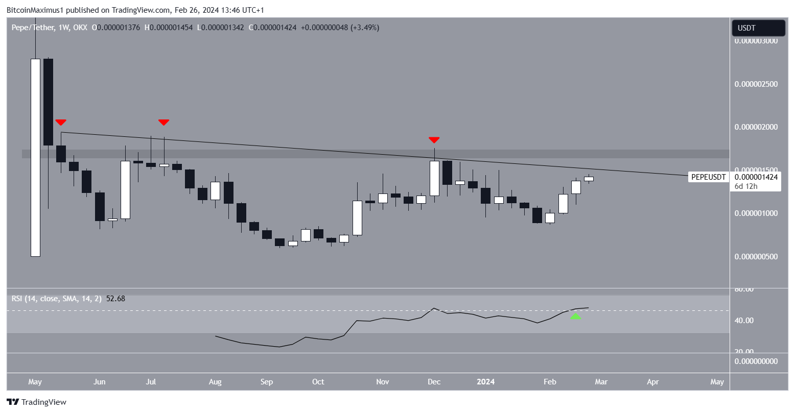The technical analysis of the weekly time frame shows the PEPE price has decreased under a long-term descending resistance trend line since May 2023. The decrease led to a low of $0.00000059 in September. The PEPE price has increased since.