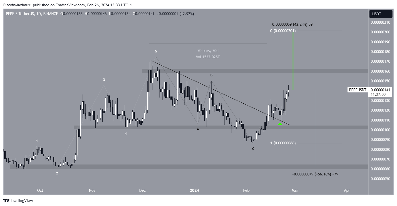 A closer look at the daily time frame suggests the PEPE price will continue increasing because of the price action and wave count. The price action shows that PEPE broke out from a descending resistance trend line and validated it as support afterward (green icon). These are both considered bullish signs.