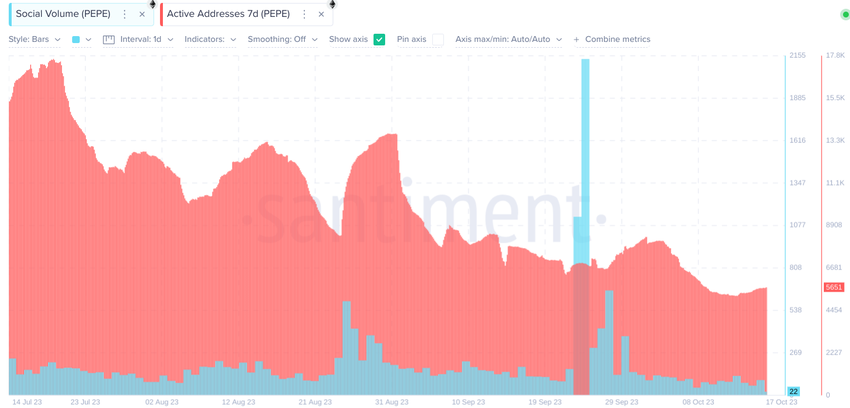 Pepe’s social and on-chain metrics also indicate growing disinterest in the project. Data from Santiment shows that the number of active addresses and Pepe’s social volume is declining.