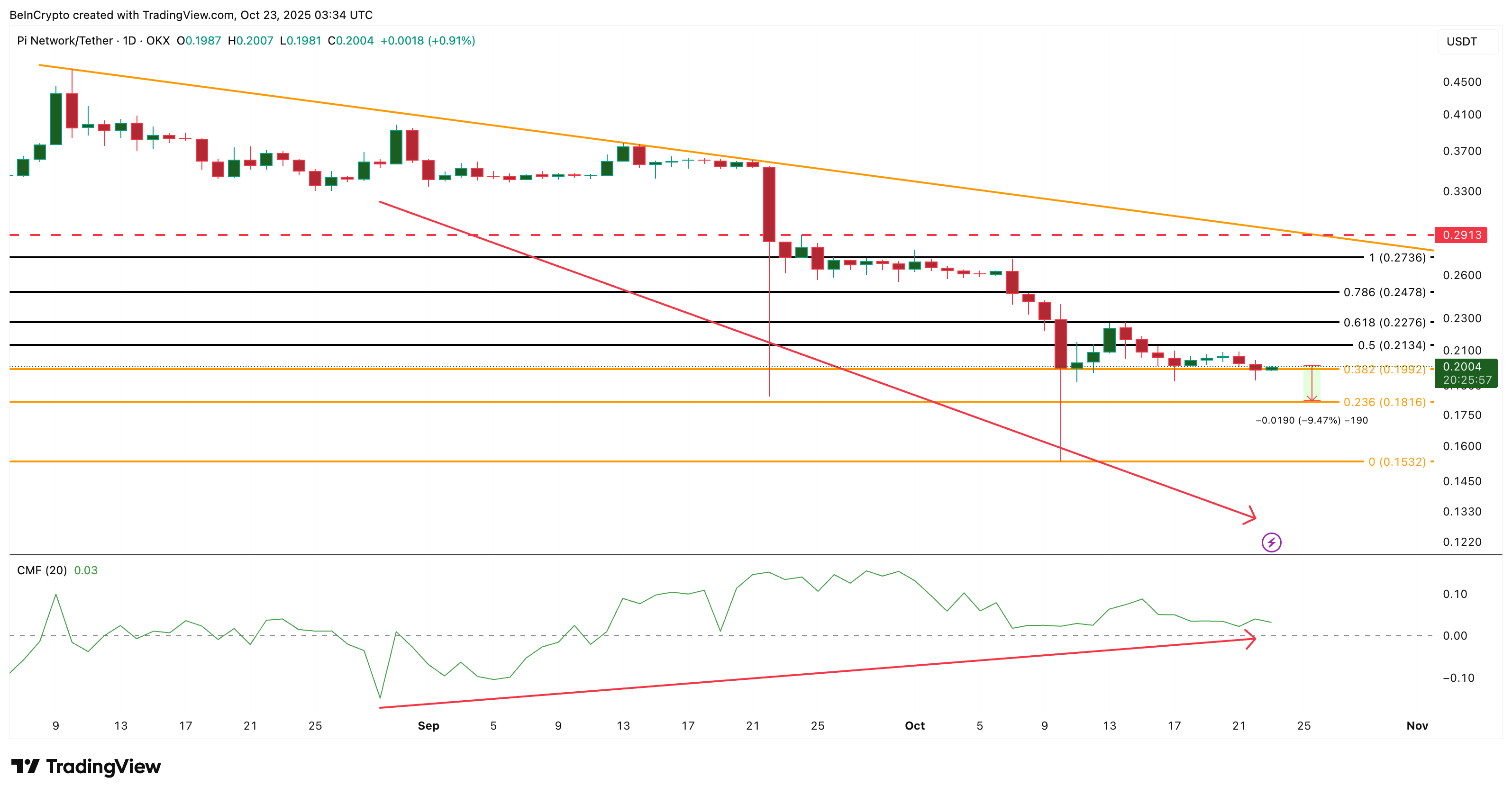 However, if $0.19 fails to hold, Pi could slip toward $0.18 (0.236 Fibonacci) or even $0.15, marking a 9%–20% downside and confirming renewed bearish momentum. However, with both RSI and CMF flashing bullish divergence, the odds of a relief rally increase if $0.19 holds.