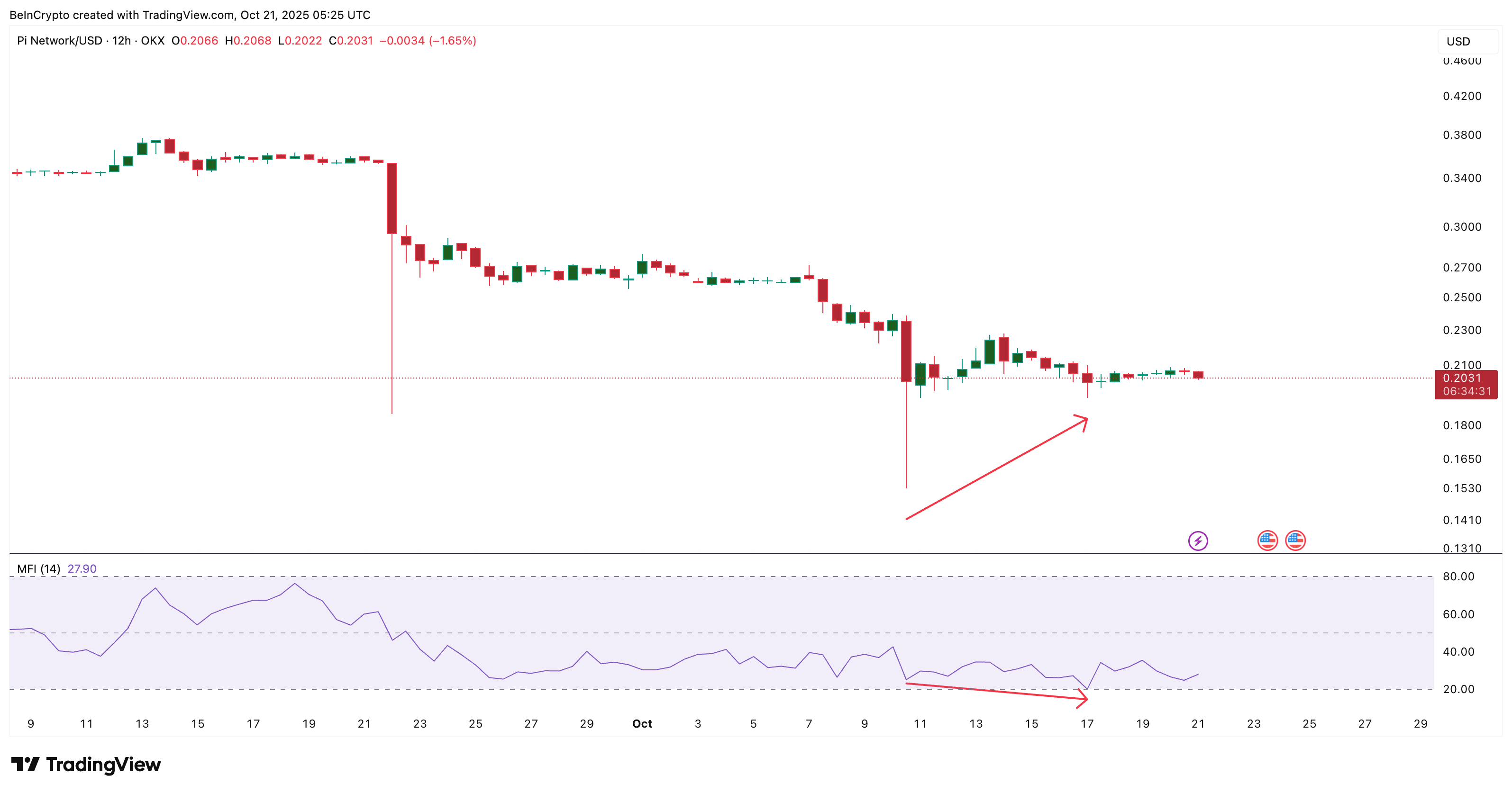 The Money Flow Index (MFI), which tracks money moving in and out of the asset, highlights a bearish divergence. Between October 10 and 17, PI’s price formed a higher low, but the MFI printed a lower low. That pattern shows weaker buying strength despite stable prices — a sign that retail traders are holding back.