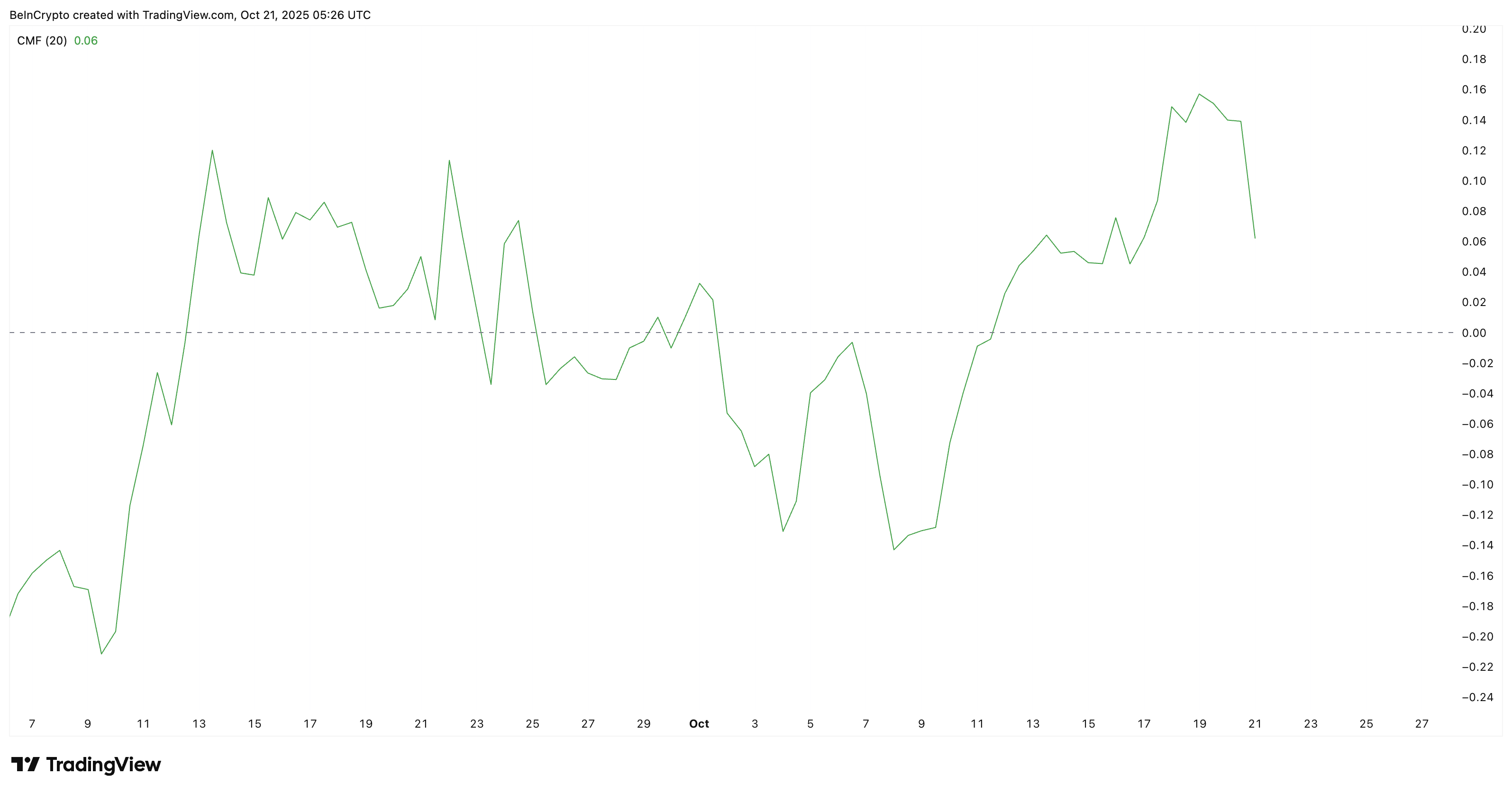 Adding to that, the Chaikin Money Flow (CMF), which tracks large money inflows, remains slightly positive but has fallen sharply since October 20. A drop in CMF above the zero line often signals that while big investors are still present, they’re pulling back on fresh buys.