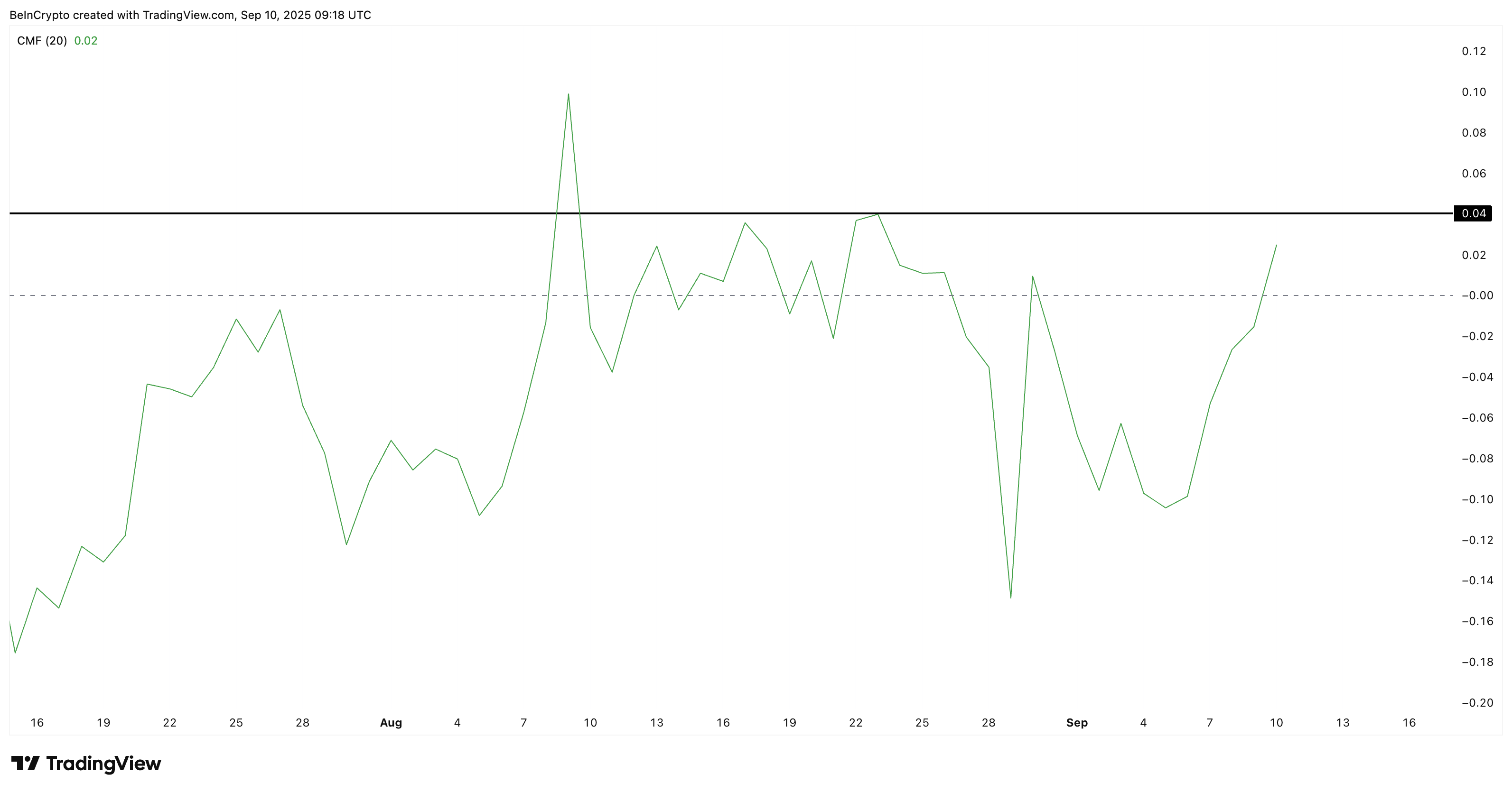 At the same time, money flows are turning slightly bullish. The Chaikin Money Flow (CMF), which tracks whether money flows in or out of an asset, has flipped positive at +0.02.