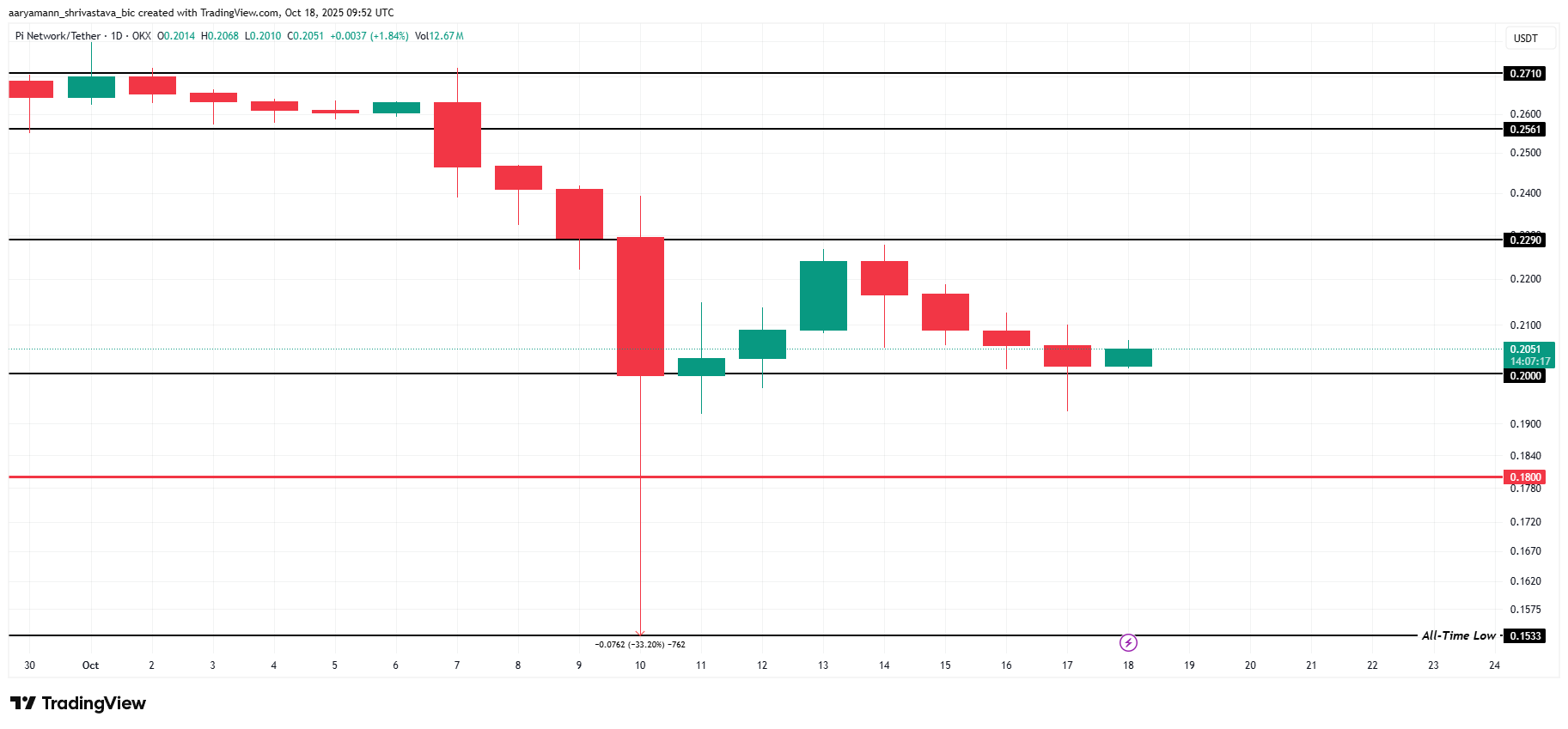 Pi Coin is trading at $0.205, holding firmly above the $0.200 support level, which has acted as a critical base for past rebounds. The level helped the altcoin recover last week, and a similar bounce could emerge if bullish sentiment builds further.