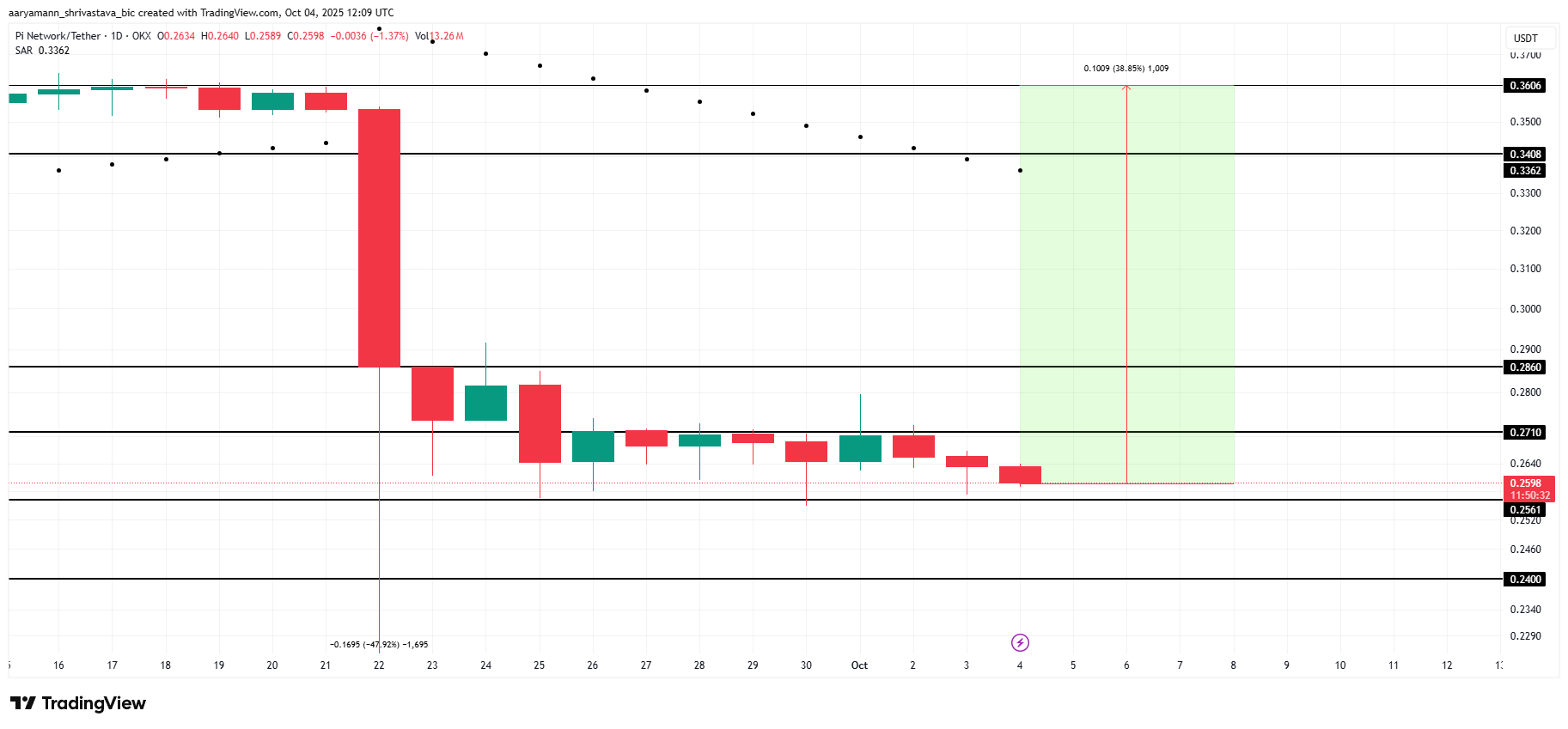 At the time of writing, Pi Coin is trading at $0.259, just above the critical support level of $0.256. This zone has acted as a key foundation for the token, preventing further declines during recent market turbulence.