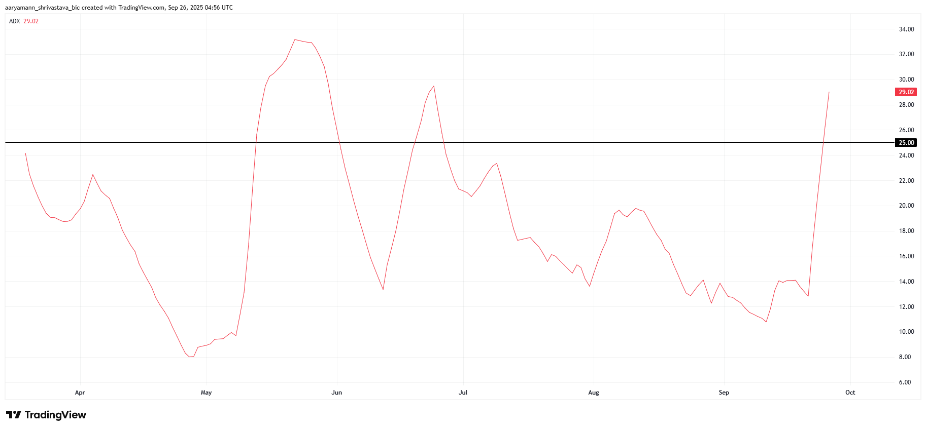 The Average Directional Index (ADX) highlights that bearish momentum is strengthening. The indicator shows Pi Coin locked in a downtrend, and its position above the 25.0 threshold confirms that momentum is gaining traction..