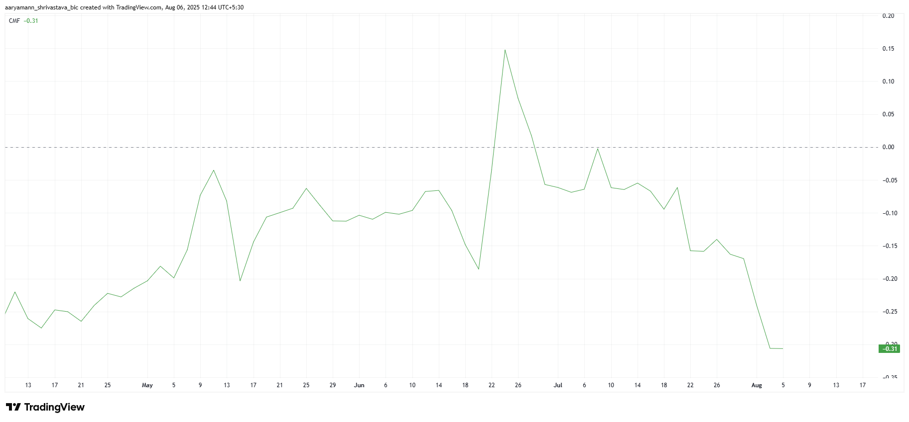 Pi Coin’s macro momentum is dominated by negative investor sentiment, as evidenced by the Chaikin Money Flow (CMF) indicator. The CMF has been steadily declining, showing that outflows are overwhelming inflows.