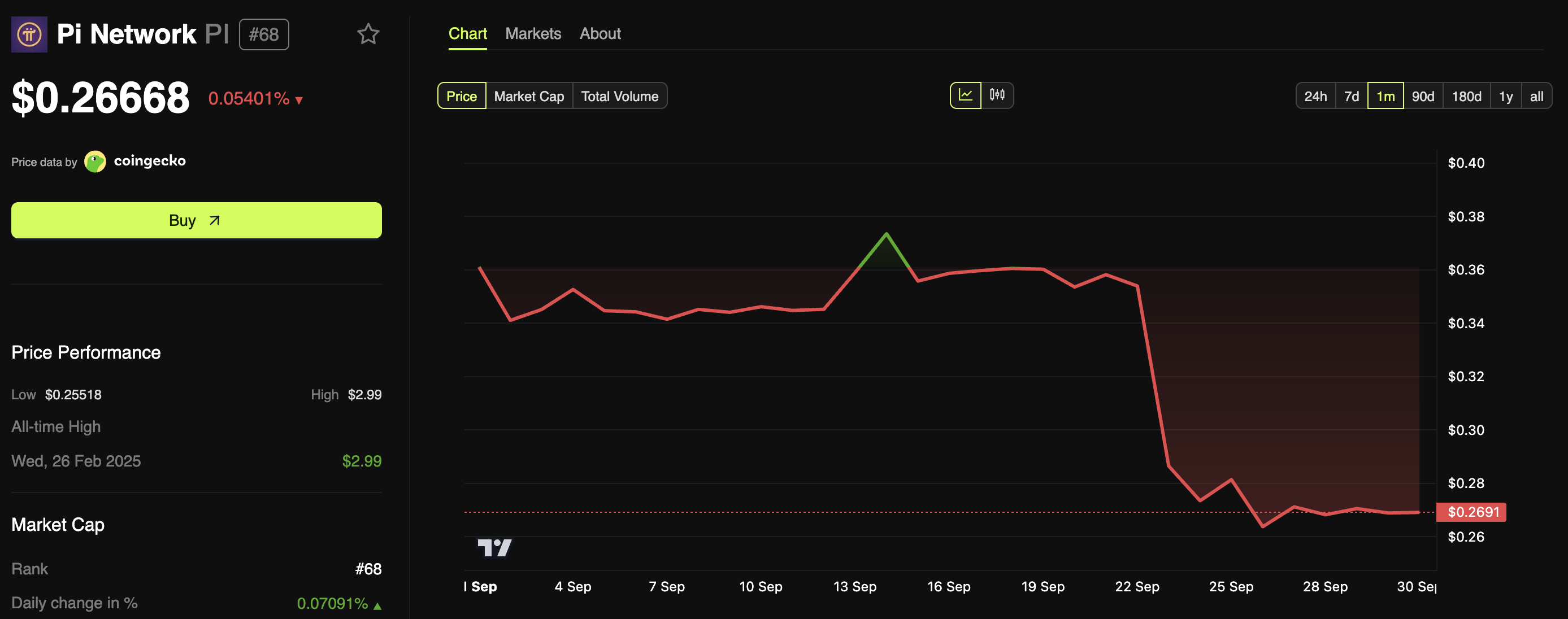 BeInCrypto Markets data showed that PI’s value has declined 30.6% over the past month. At the time of writing, the coin was trading at $0.26, reflecting a 0.54% decline over the past 24 hours.
