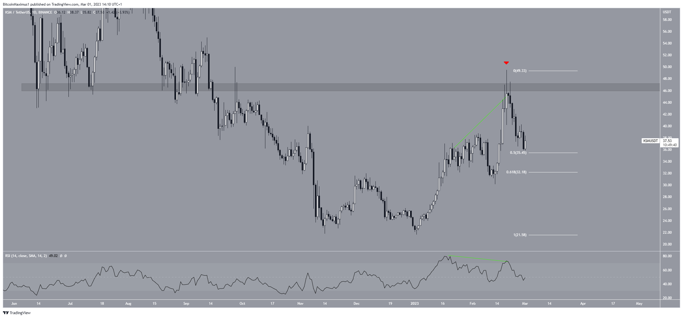 The KSM token price has increased significantly since the beginning of the year. The increase led to a new yearly high of $49.49 on Feb. 19. However, the price failed to break out above the $46.50 resistance area, instead creating a long upper wick (red icon) and falling. The drop was preceded by bearish divergence in the daily RSI (green line).