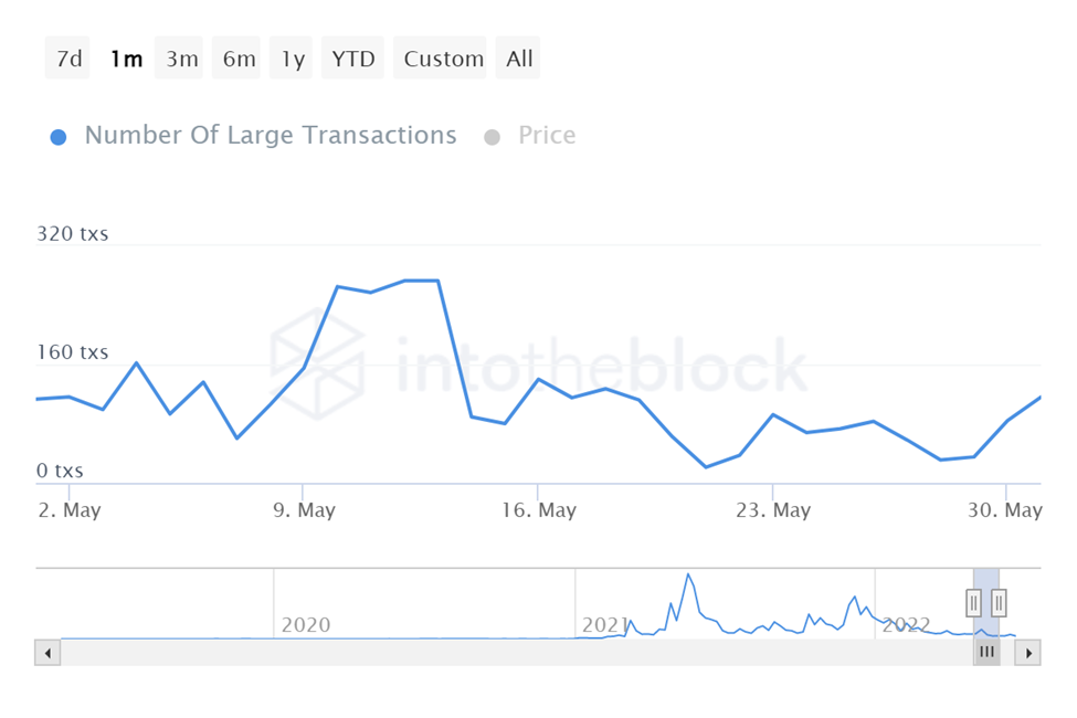 The number of large transactions involving MATIC reached a peak of 273,000 at a price of $0.669950 on May 13.