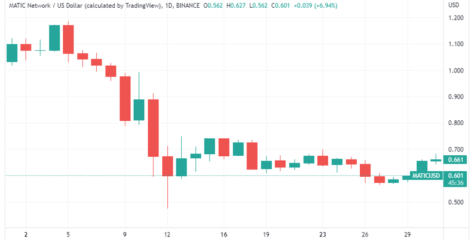 MATIC opened on May 1, at $1.04, reached a monthly high of $1.19 on May 5, tested a monthly low of $0.5084, and ended the month at a trading price of $0.6621. Overall, this equates to a 36% decrease in the opening and closing prices of MATIC in May.