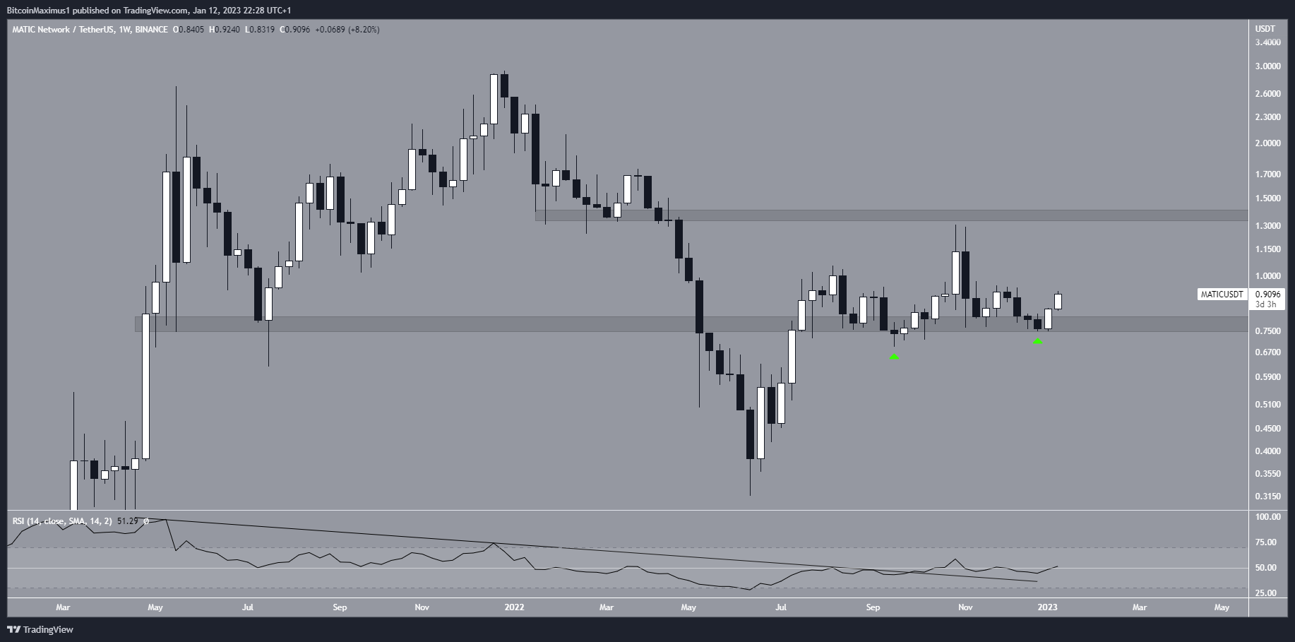 If the MATIC token price breaks out, there would be Fib resistances at $0.97 and $1.10 before the main resistance area at $1.38.