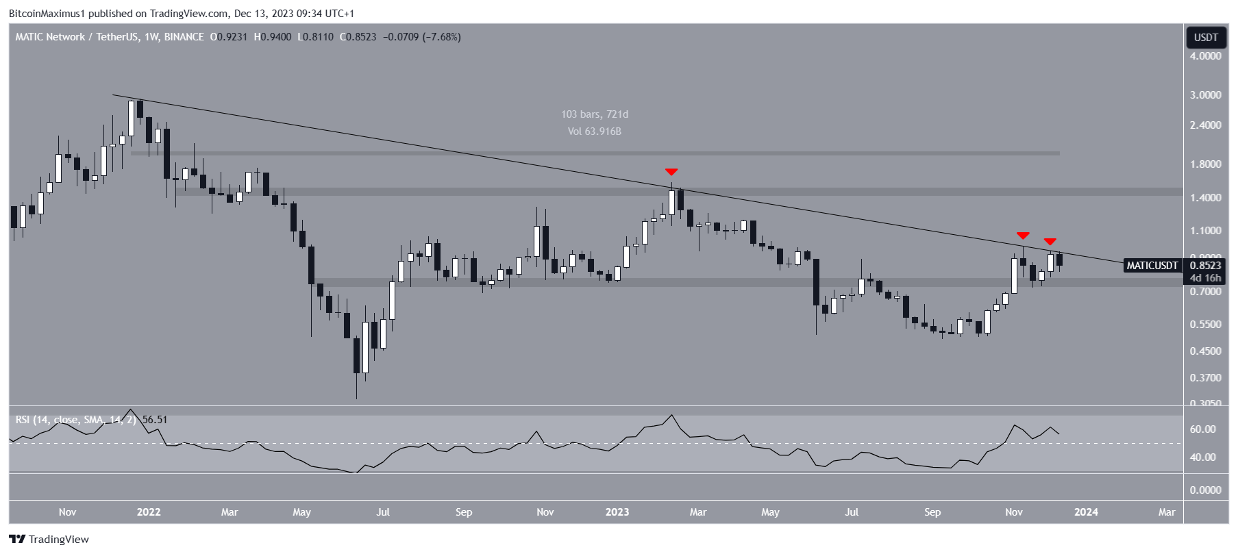 The MATIC price began an upward movement afterward. Until now, it has made three unsuccessful breakout attempts (red icons), the most recent last week. So far, the long-term trend line has been in place for 720 days.