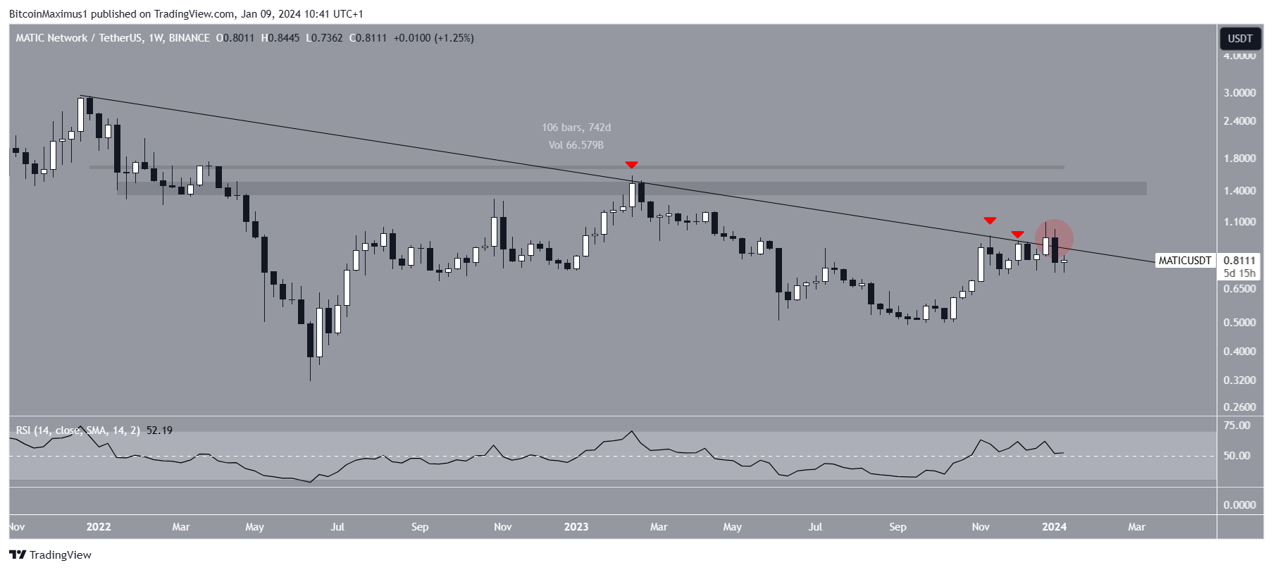 However, the breakout was illegitimate since the MATIC price created a bearish candlestick the next week (red circle), falling below the trend line again, which has been in place for more than 740 days.