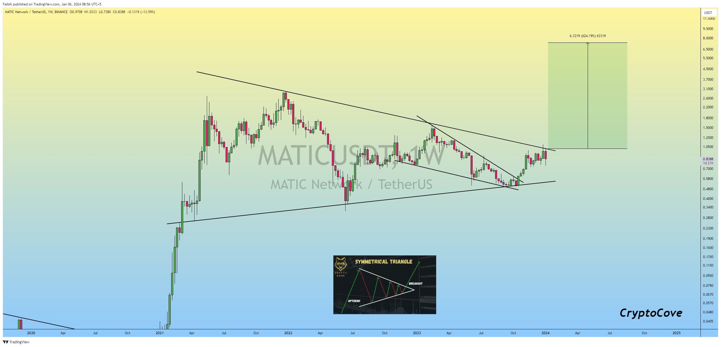 Captain Faibik suggests a 600% rally is expected once the price breaks out from its long-term pattern.