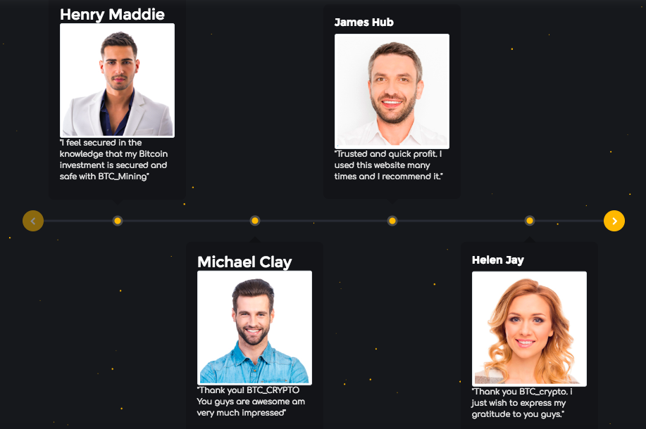 In what appears to be a tradition with scam projects, BTC-mining has also decided to add several obviously-fake testimonials to the front page — featuring not-so-convincing reviews from the likes of ‘Henry Maddie’ and ‘Helen Jay.’
