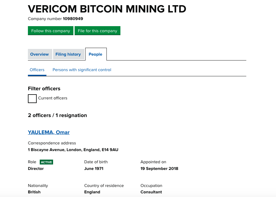 Looking at the company registration details, Vericom Bitcoin Mining LTD was incorporated in Sep 2017 — operating as a business and domestic software development company. Interestingly, the company was taken over by one Omar Yaulema in Sep 2018, just weeks before the web domain for BTC-mining was registered.