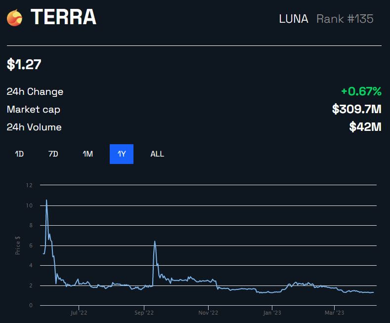 The rebranded Terra 2.0 chain has gained very little traction. Its LUNA token was trading at $1.27 at the time of writing.