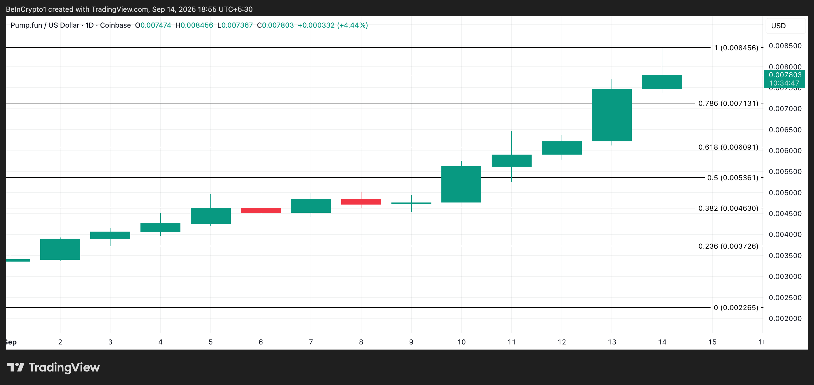 The altcoin briefly touched an all-time high of $0.008456 earlier today, highlighting the intensity of the rally. With a climbing bullish bias, PUMP appears poised to register further gains as traders enter the new week.