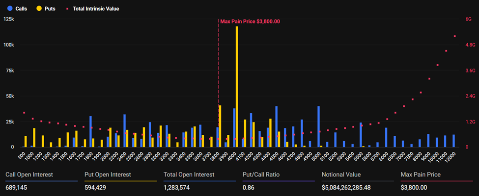 However, the maximum pain level is $3,800, which is uncomfortably close to ETH’s current price of $3,963 after its sharp sell-off this week.