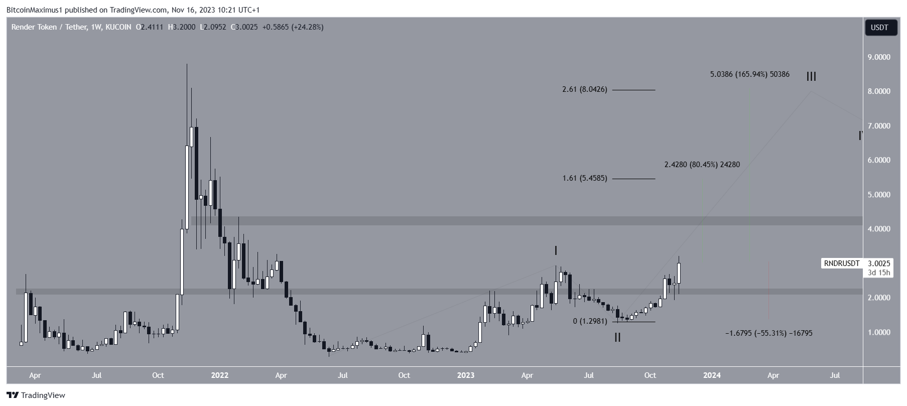 Cryptocurrency trader AltStreetBet used Elliott Wave Theory to suggest that the RNDR price will increase towards a new all-time high. He states that the price is likely in wave three of a five-wave upward movement.